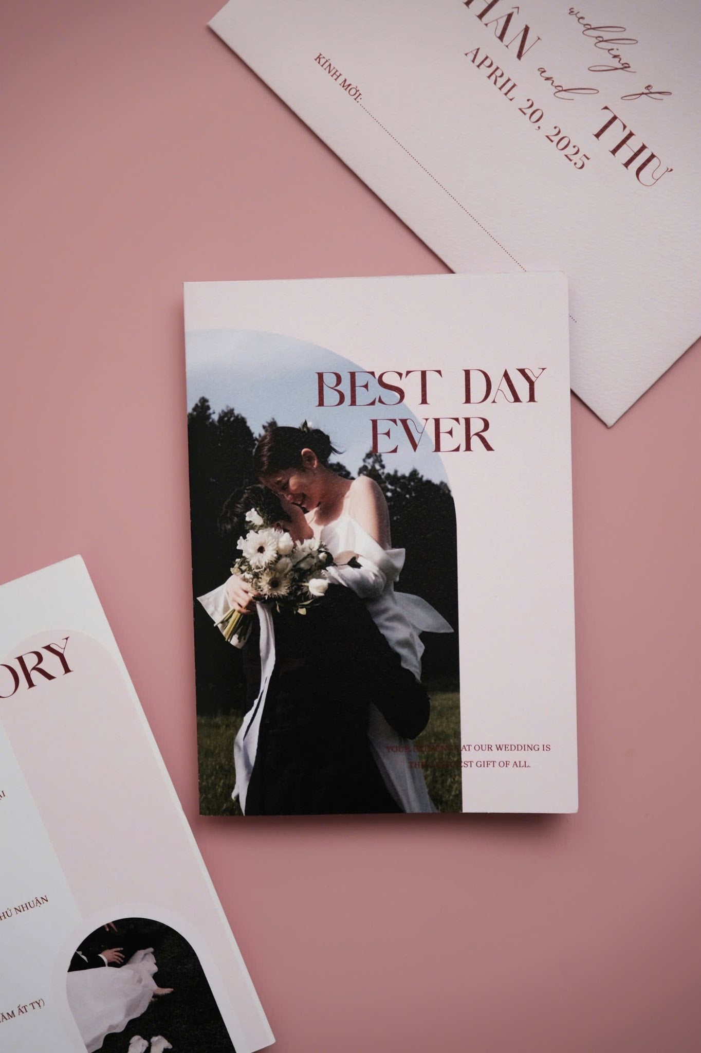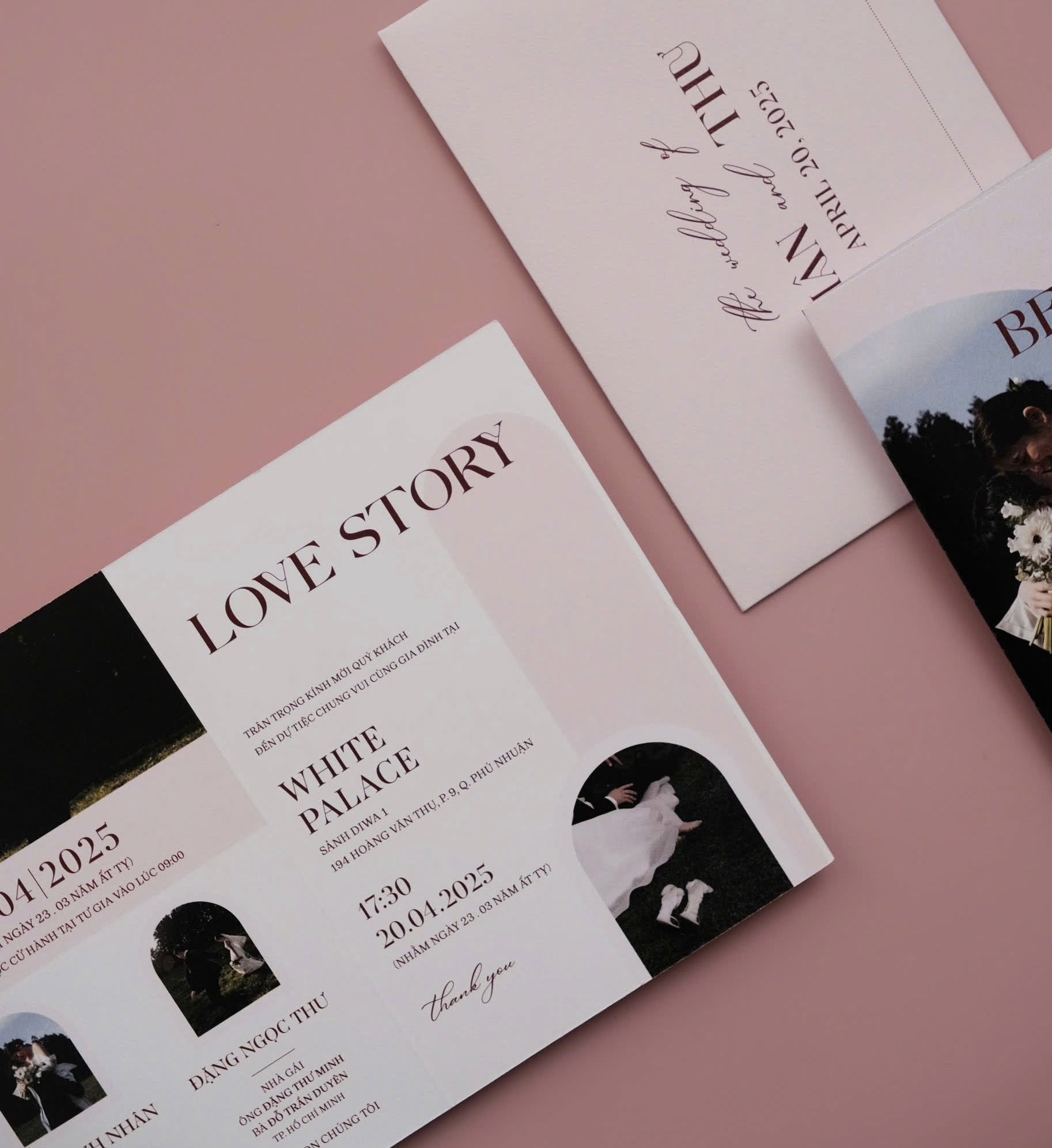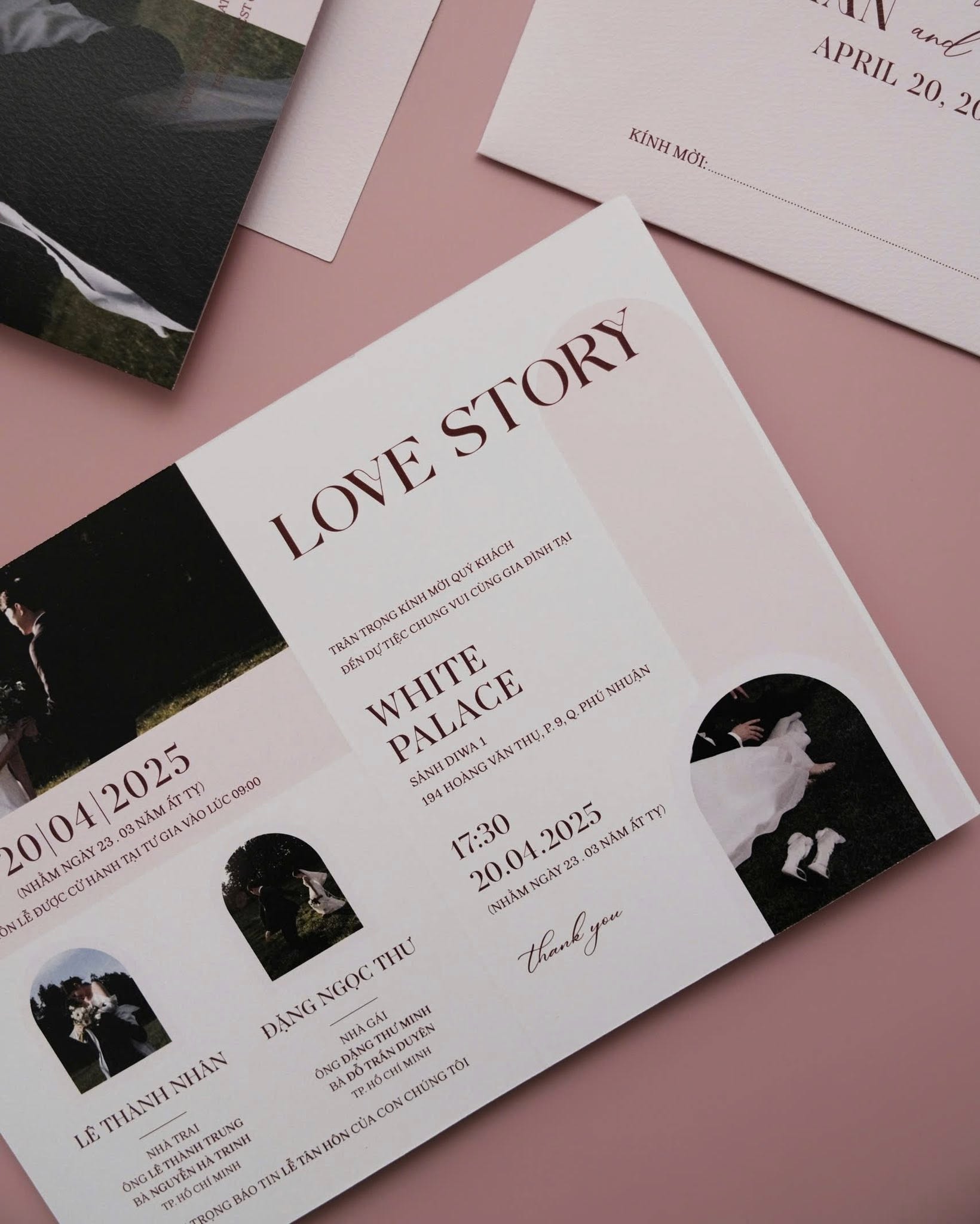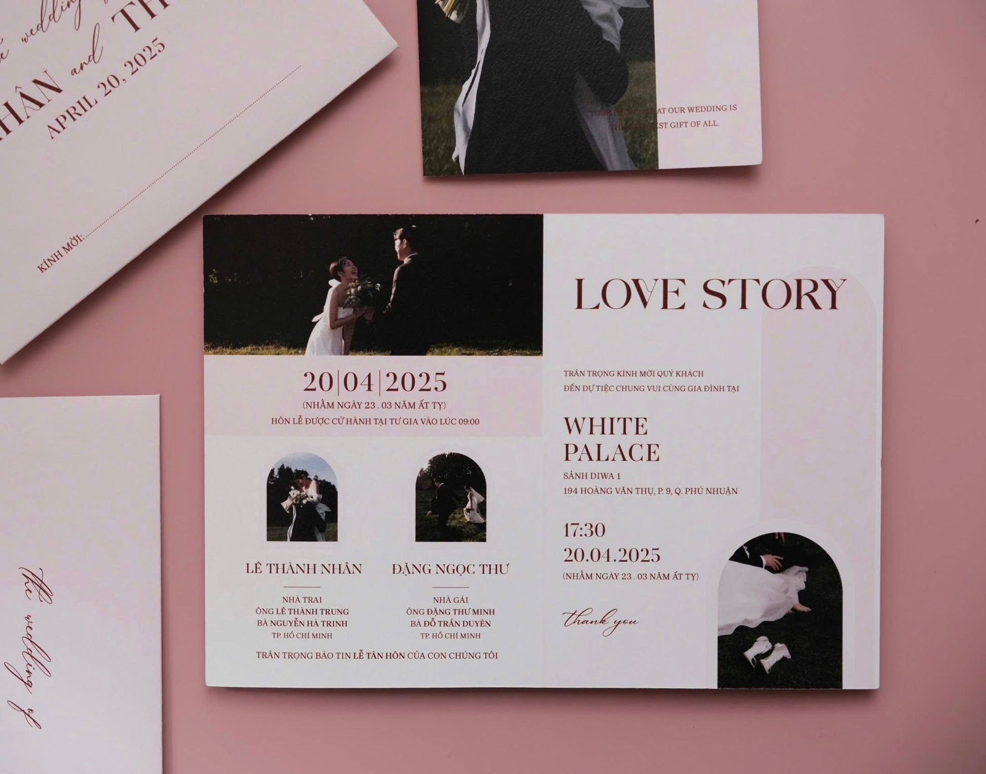 - The "Eternal Blossom" invitation mirrors the timeless elegance of Nhân and Thu’s love story. The design features delicate floral motifs intertwined with gold accents, symbolizing prosperity and unity. blend tradition with modernity, while the structured layout exudes sophistication and the White Palace venue details adds cultural depth. , this card radiates grace, harmony, and the promise of "BEST I EVER LOVE."