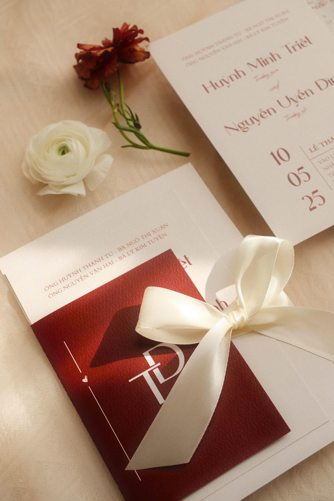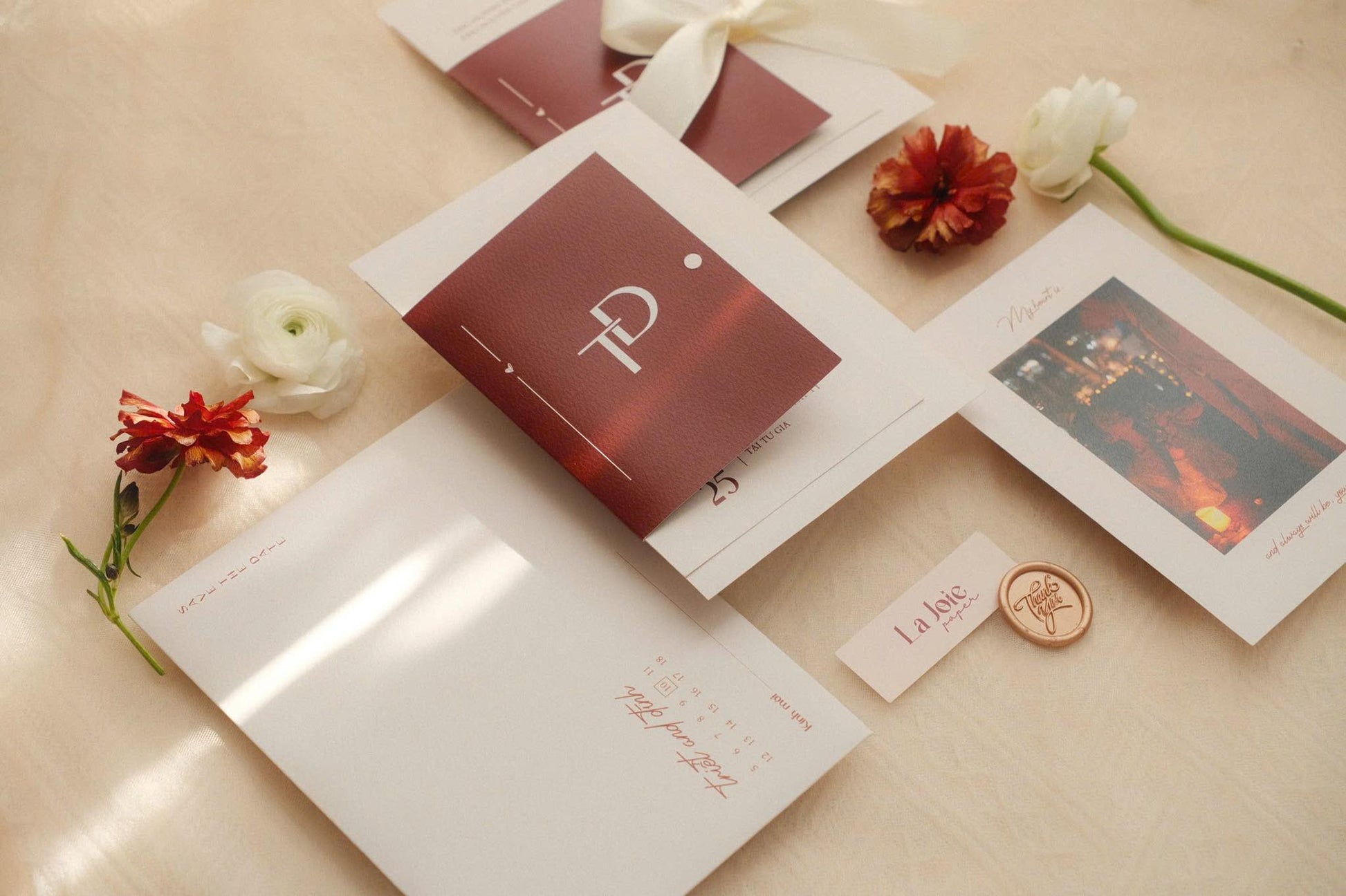 This invitation exudes timeless sophistication with gold leaf accents and a minimalist floral motif, perhaps inspired by magnolias or calla lilies—symbols of purity and joy. The clean typography and monochromatic color palette (ivory and gold) create a chic yet casual look that is perfect for a sophisticated celebration. The delicate details add an artistic touch, making it a treasured keepsake.